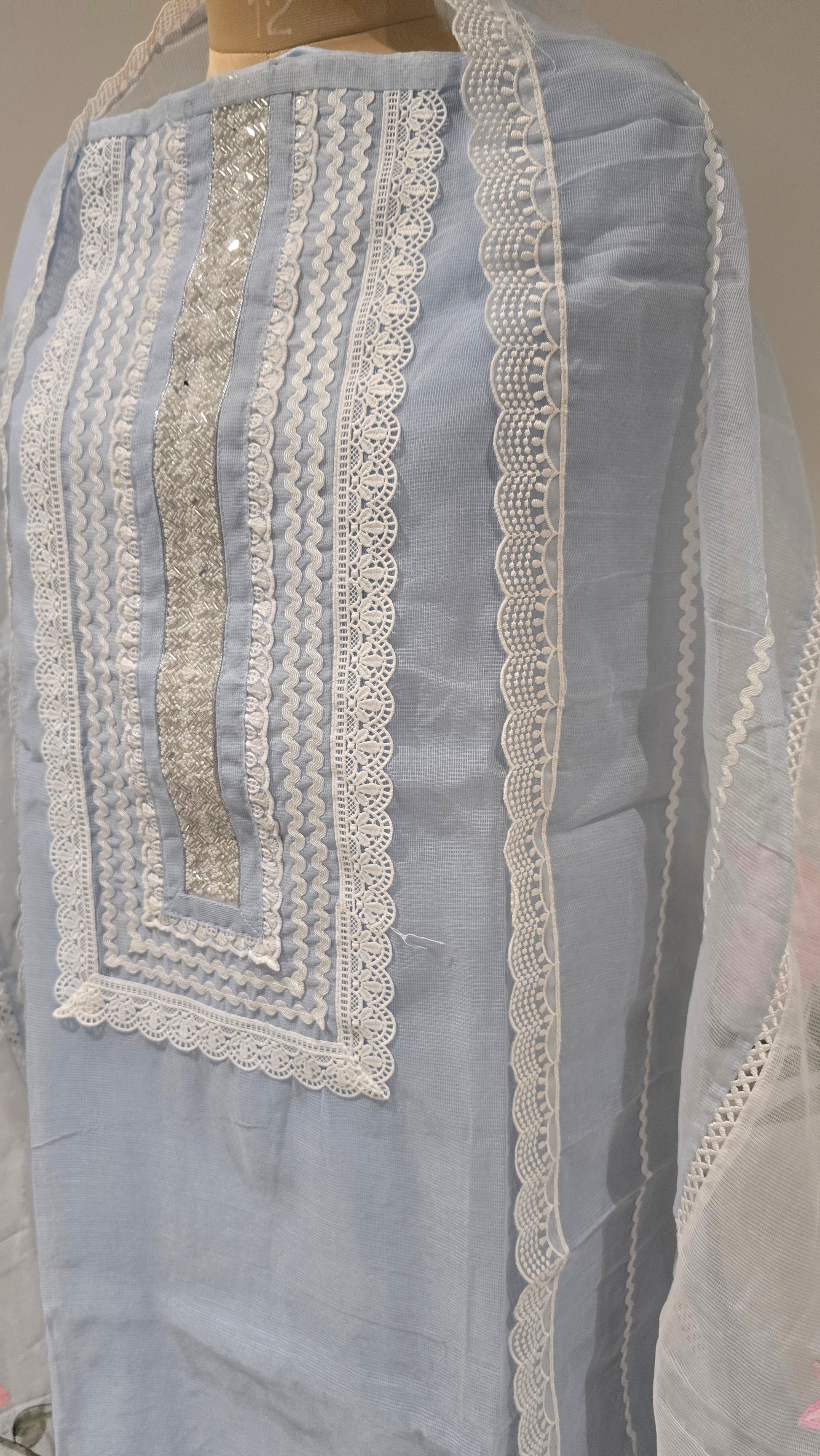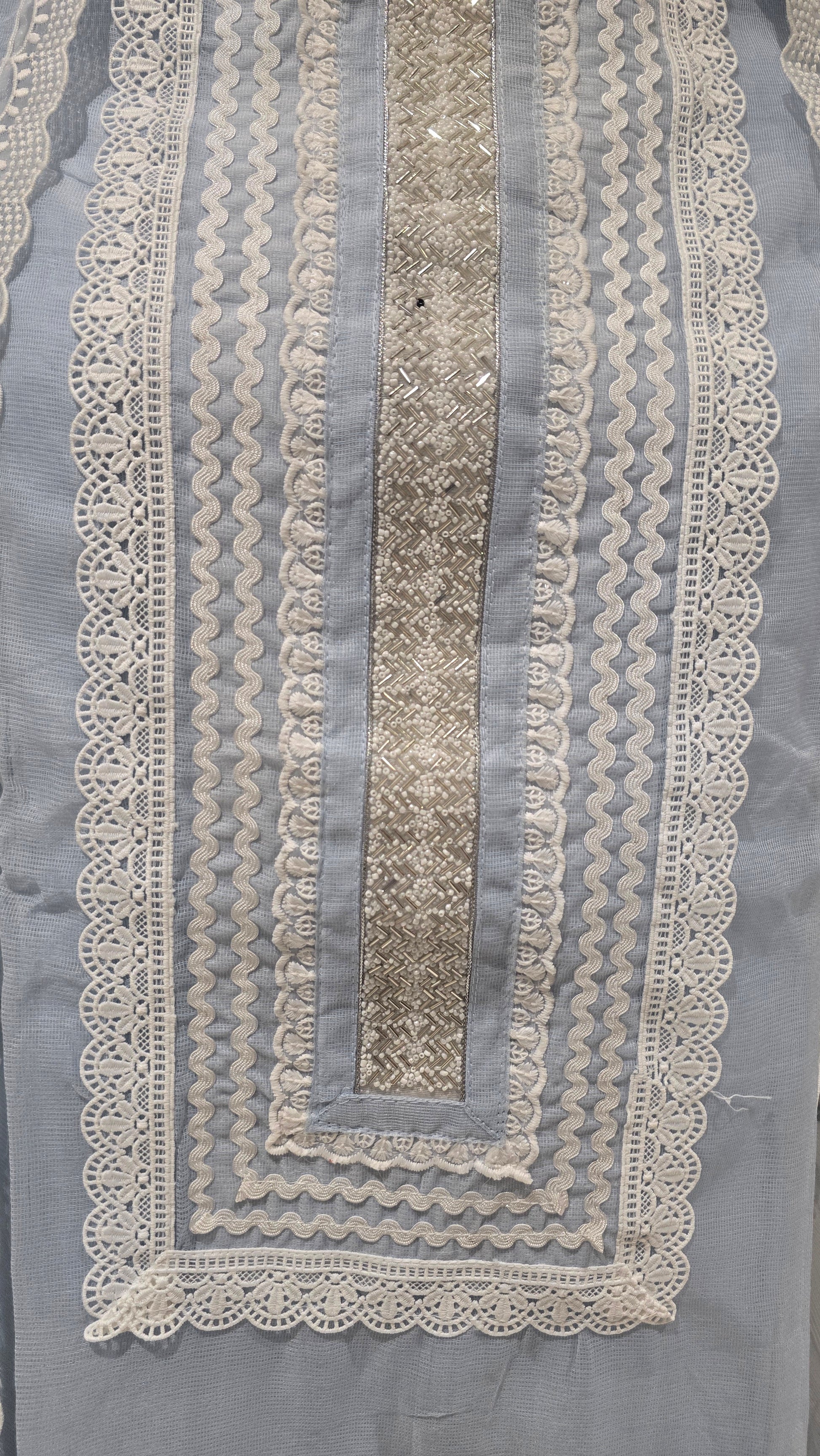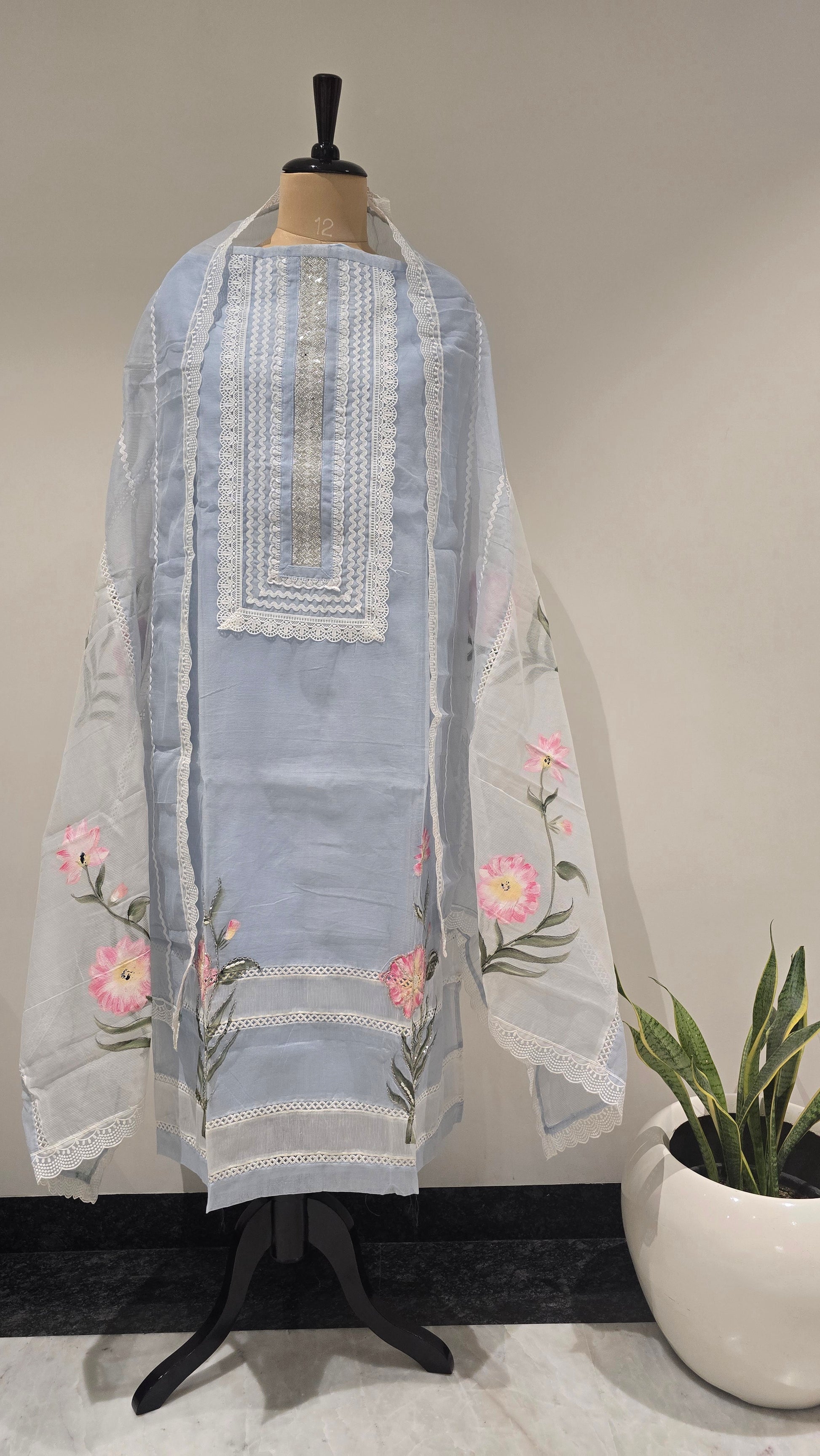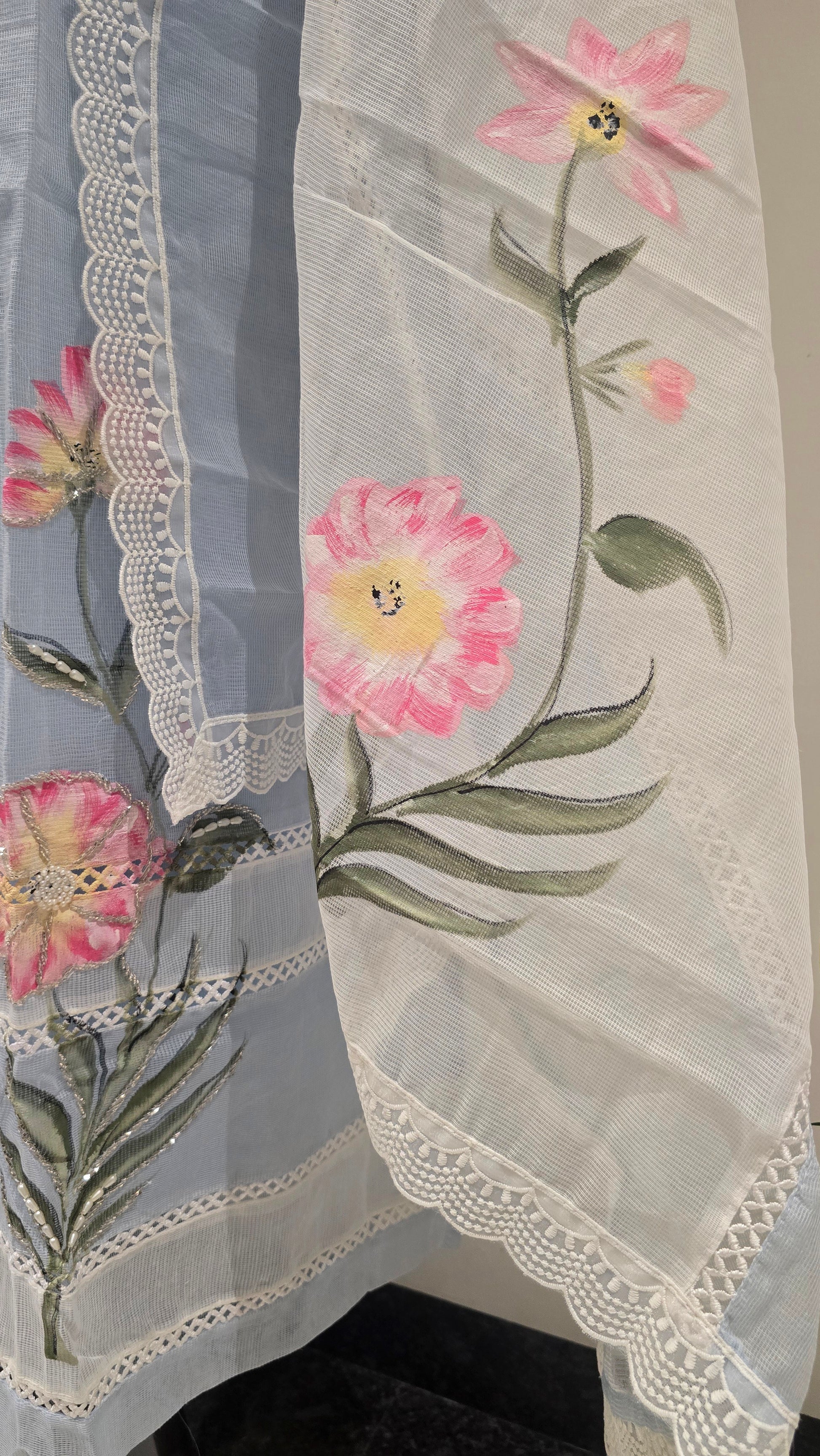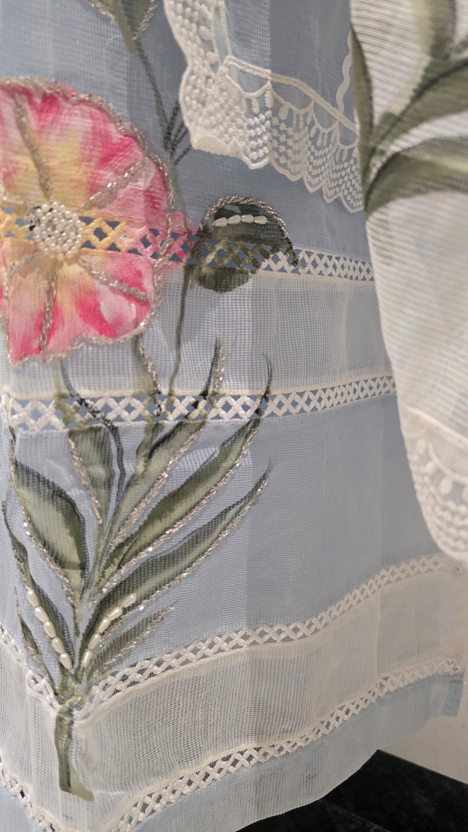 In sheer supernet fabric, this suit features hand-painted florals, lace accents, and delicate beadwork around a finely detailed neckline.