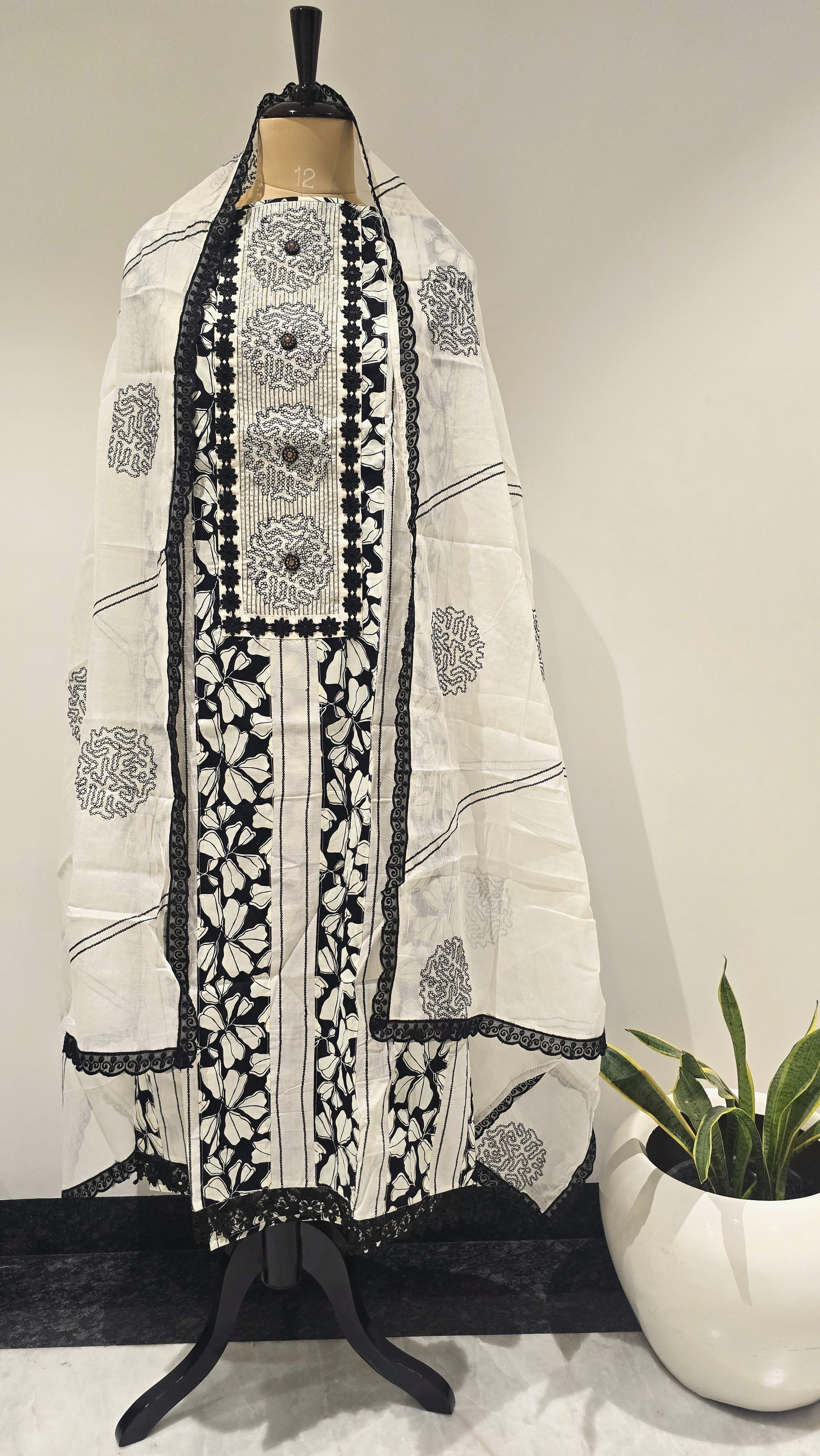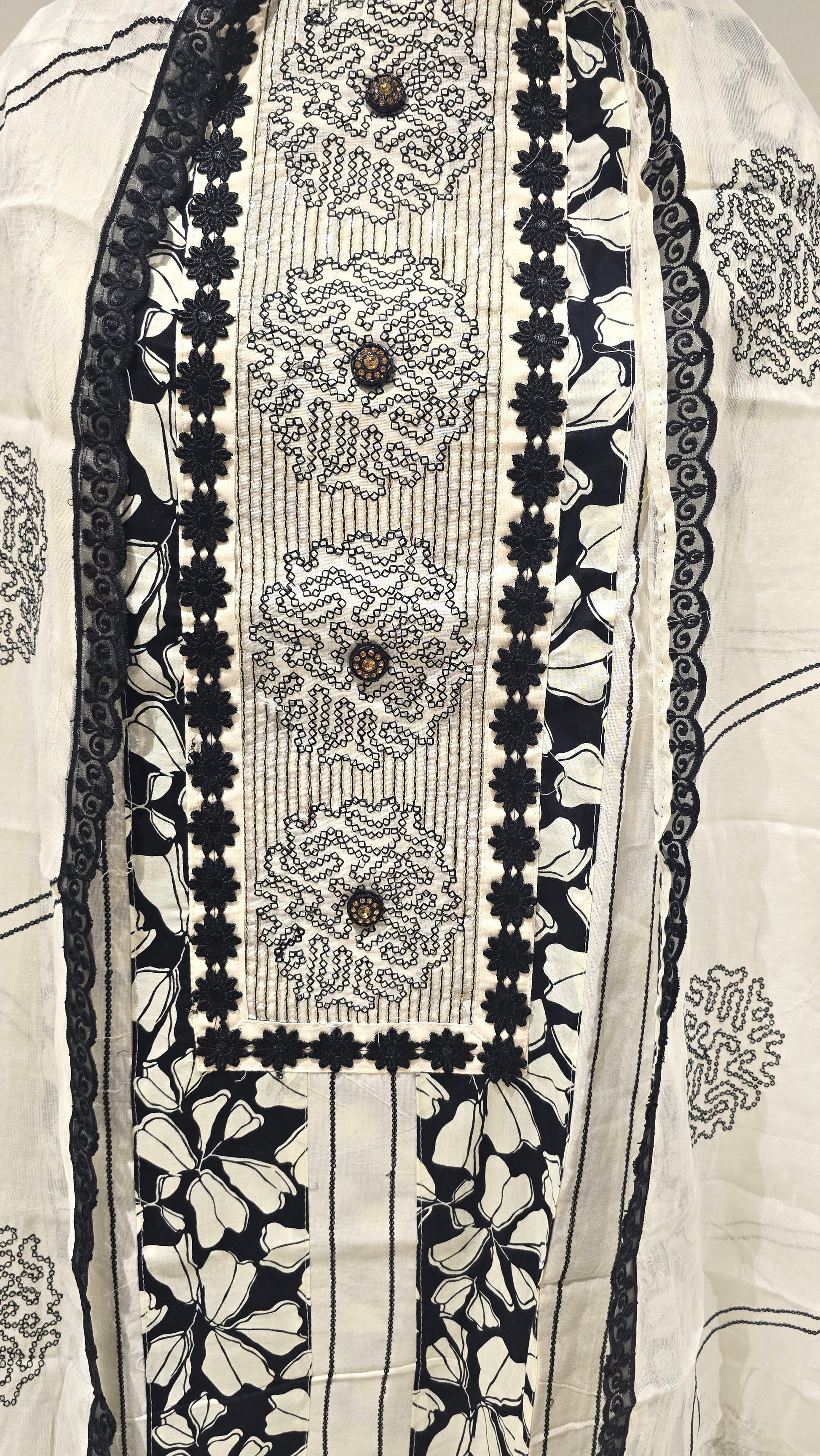 Crafted in lightweight cotton, this unstitched suit sparkles with sequin work and is finished with delicate lacework. Easy to wear and effortlessly stylish.