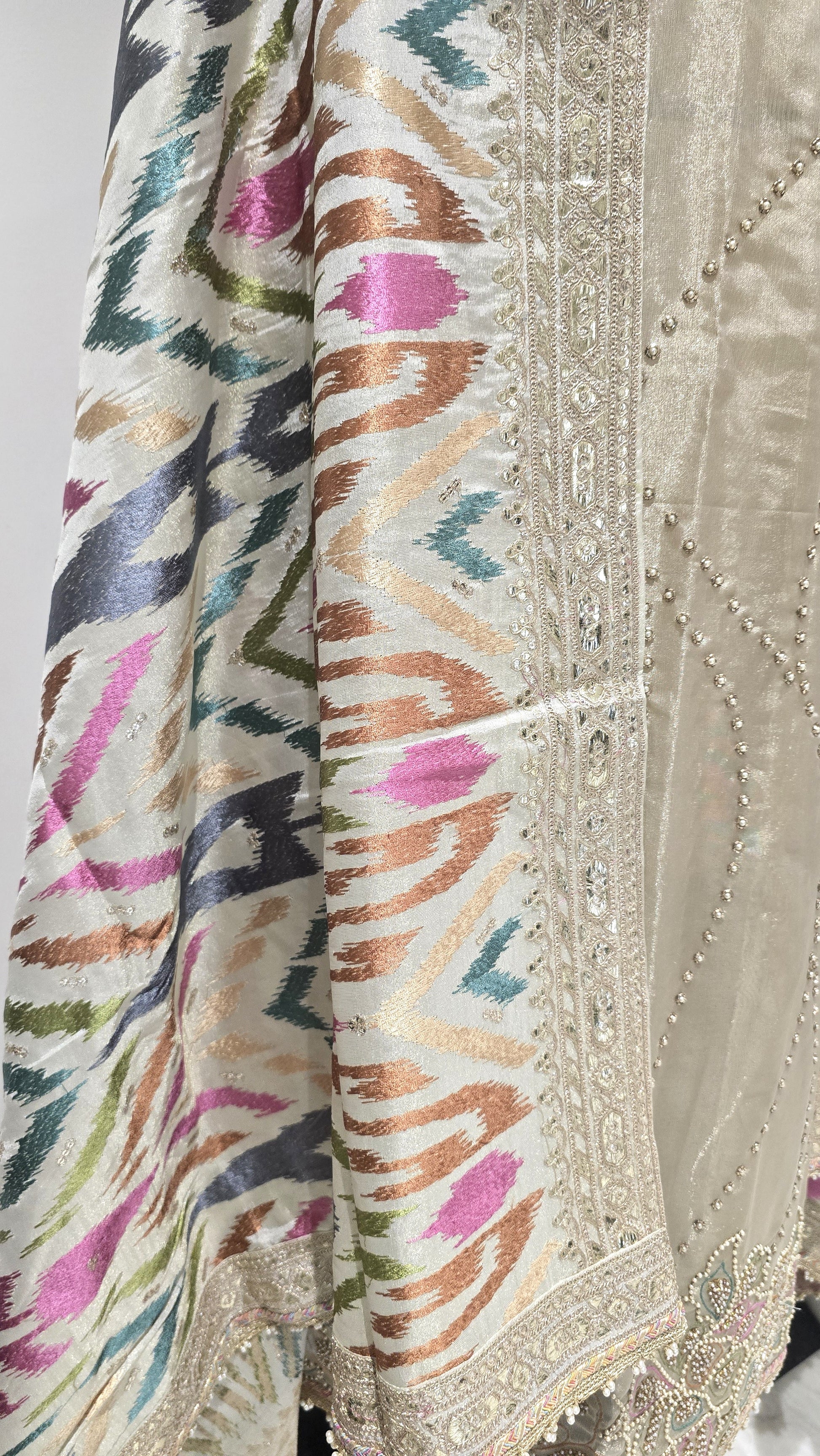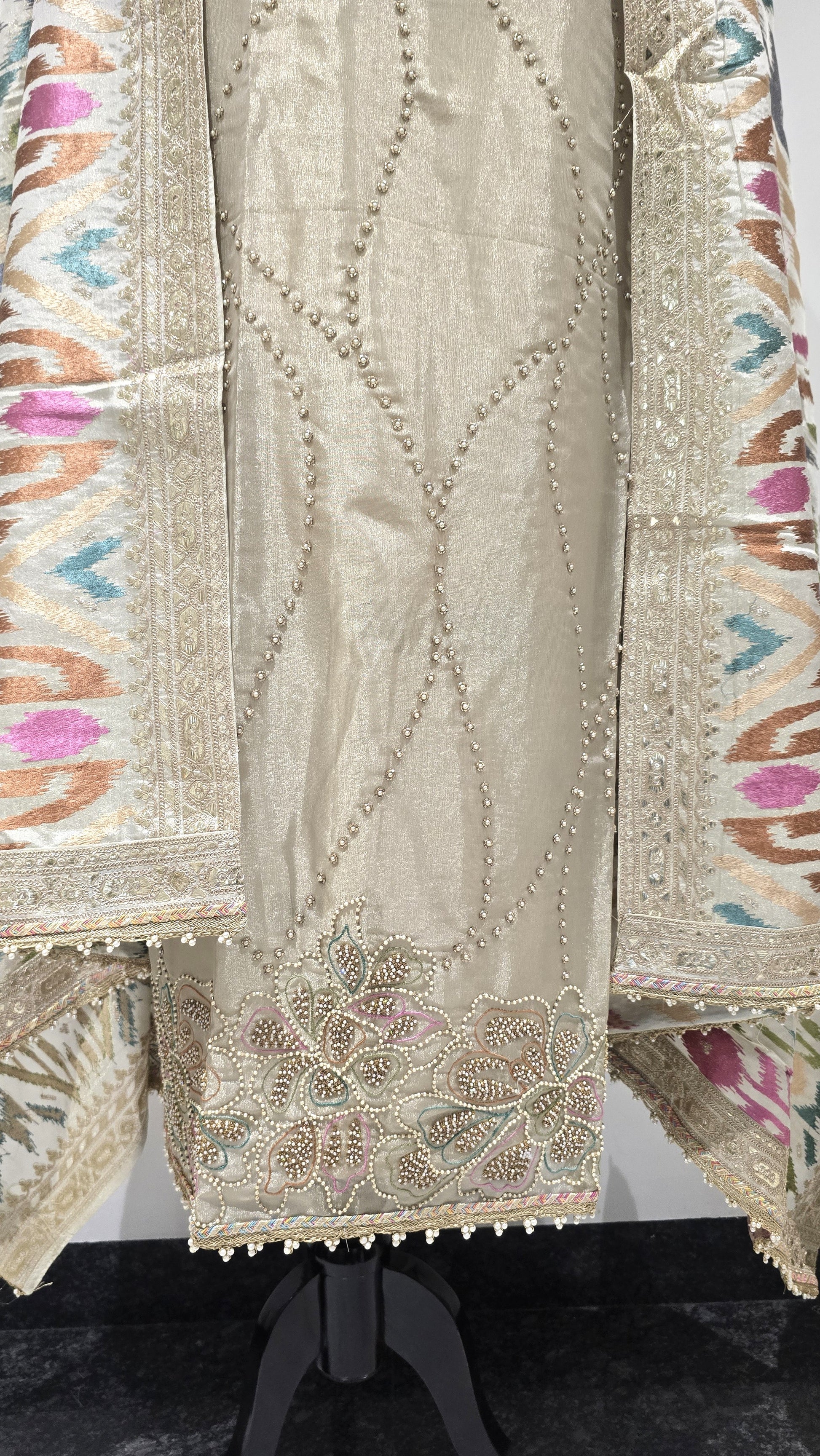 An opulent unstitched suit in premium Tissue, showcasing luxe edition stone work, a designer heavy dupatta, and elegant styling for occasion wear. Ideal for grand celebrations.