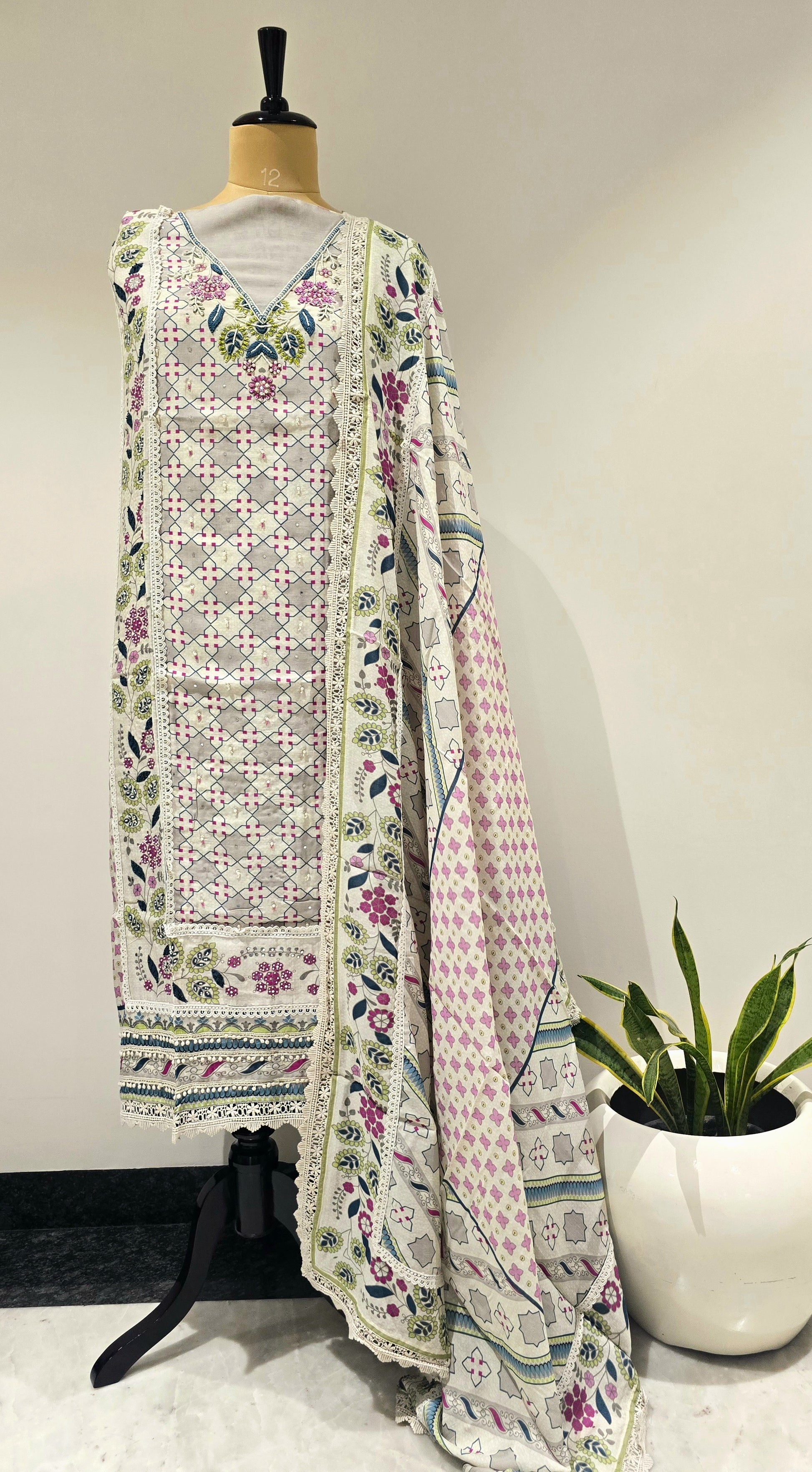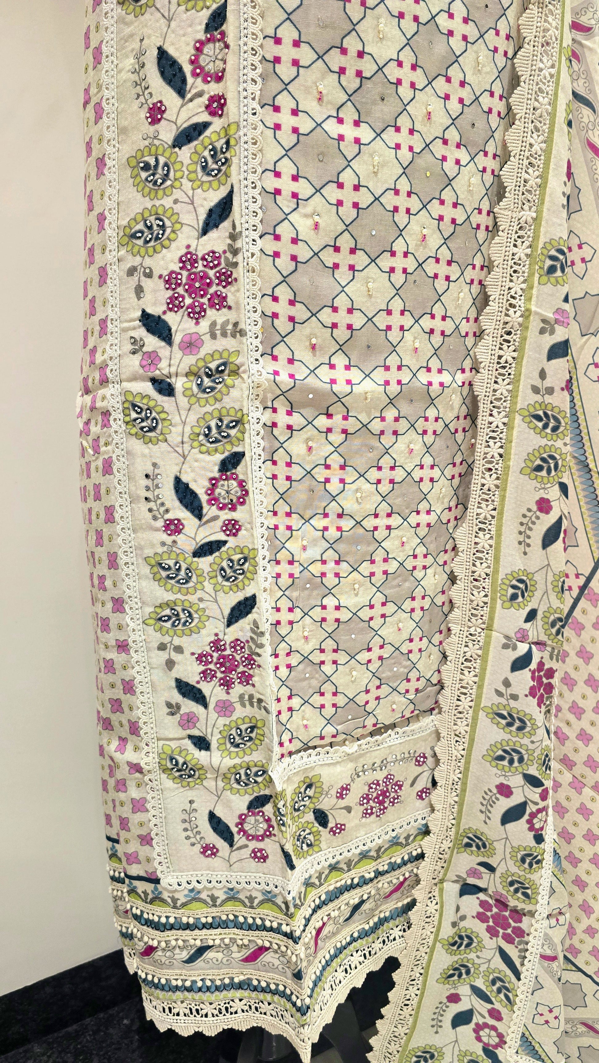 The Gulabi Lavika Artisanal Suit in soft cotton features an elegant all-over floral print, intricate lacework and beadwork, and a beautifully crafted heavy neckline for a timeless, feminine look.