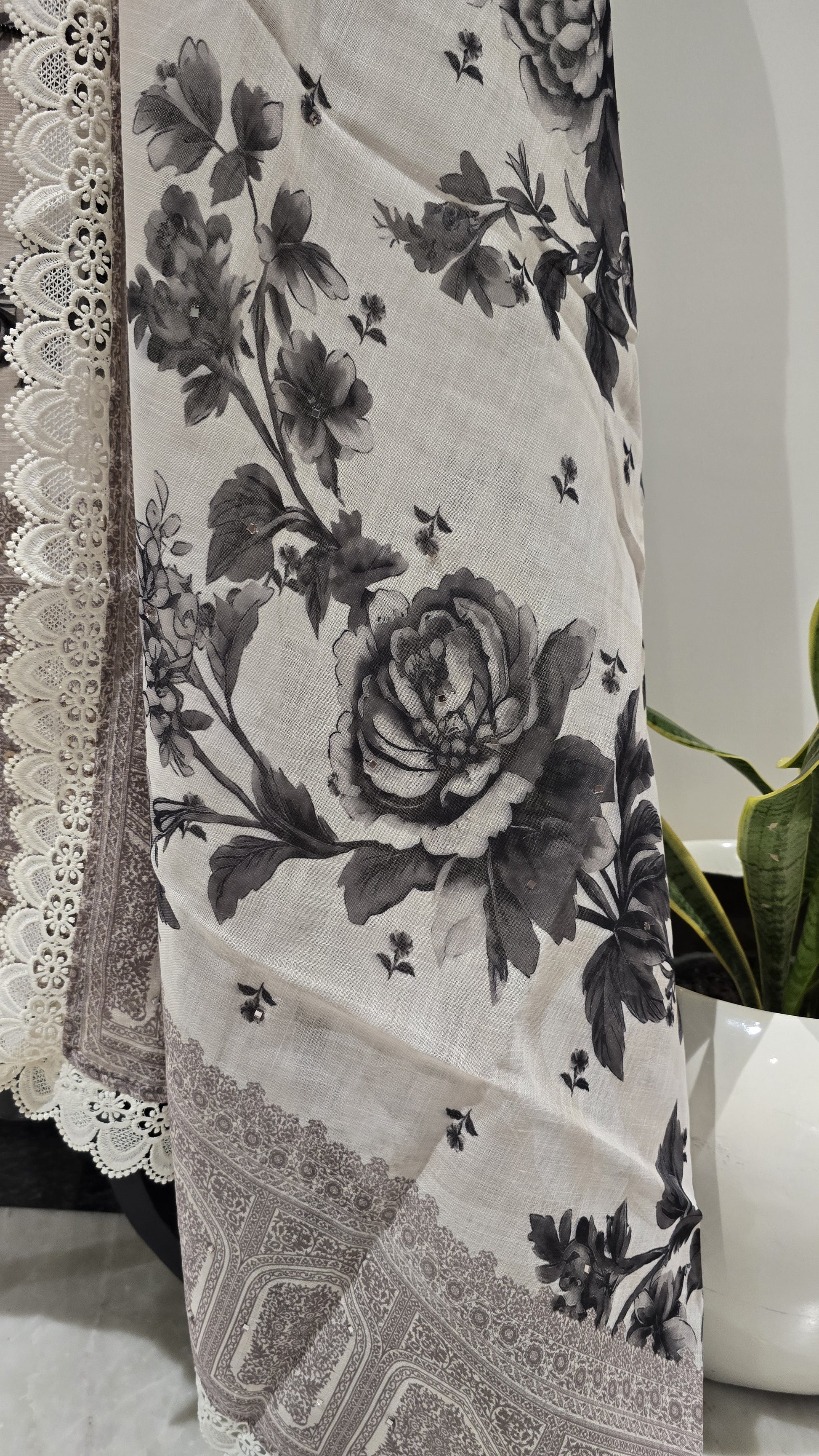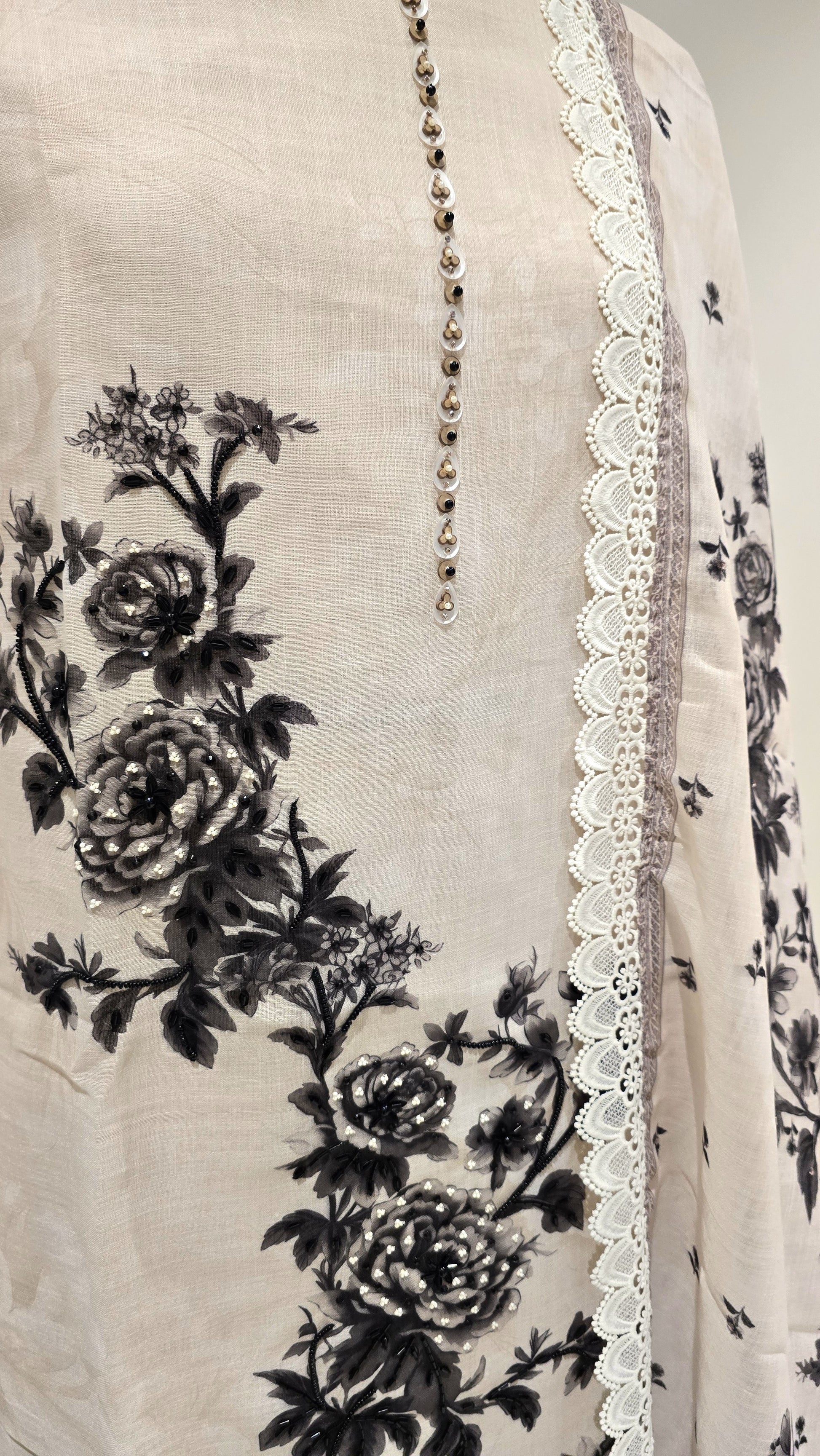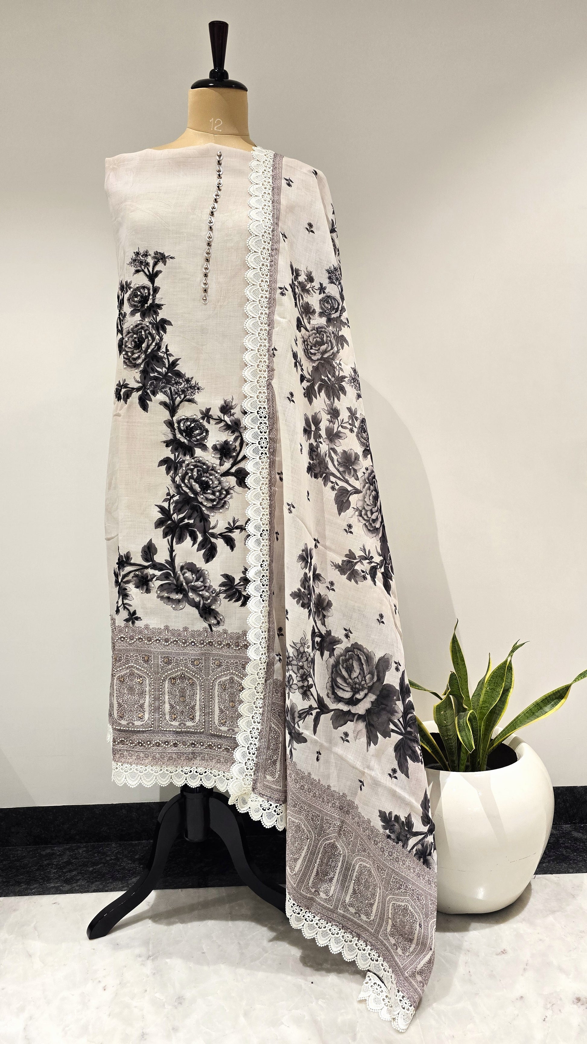 This unstitched suit set is crafted from breathable linen, featuring delicate beadwork, intricate lacework, and a distinctive asymmetric print. A truly unique suit that combines elegance with modern flair, ideal for statement dressing.