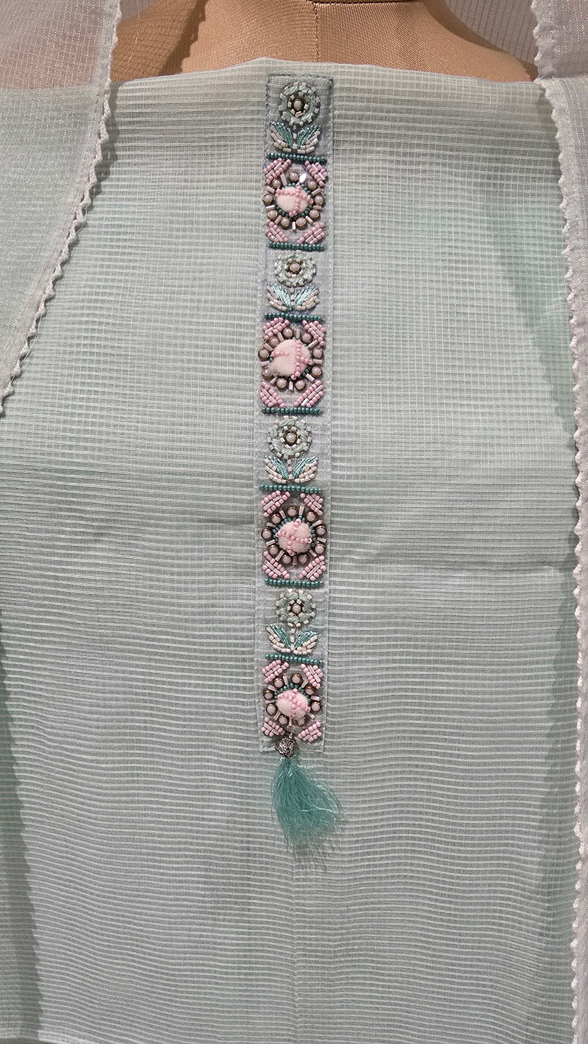 In airy Kota fabric, this dual-tone suit features delicate beadwork and thread embroidery, bringing out its soft mint and blush hues.