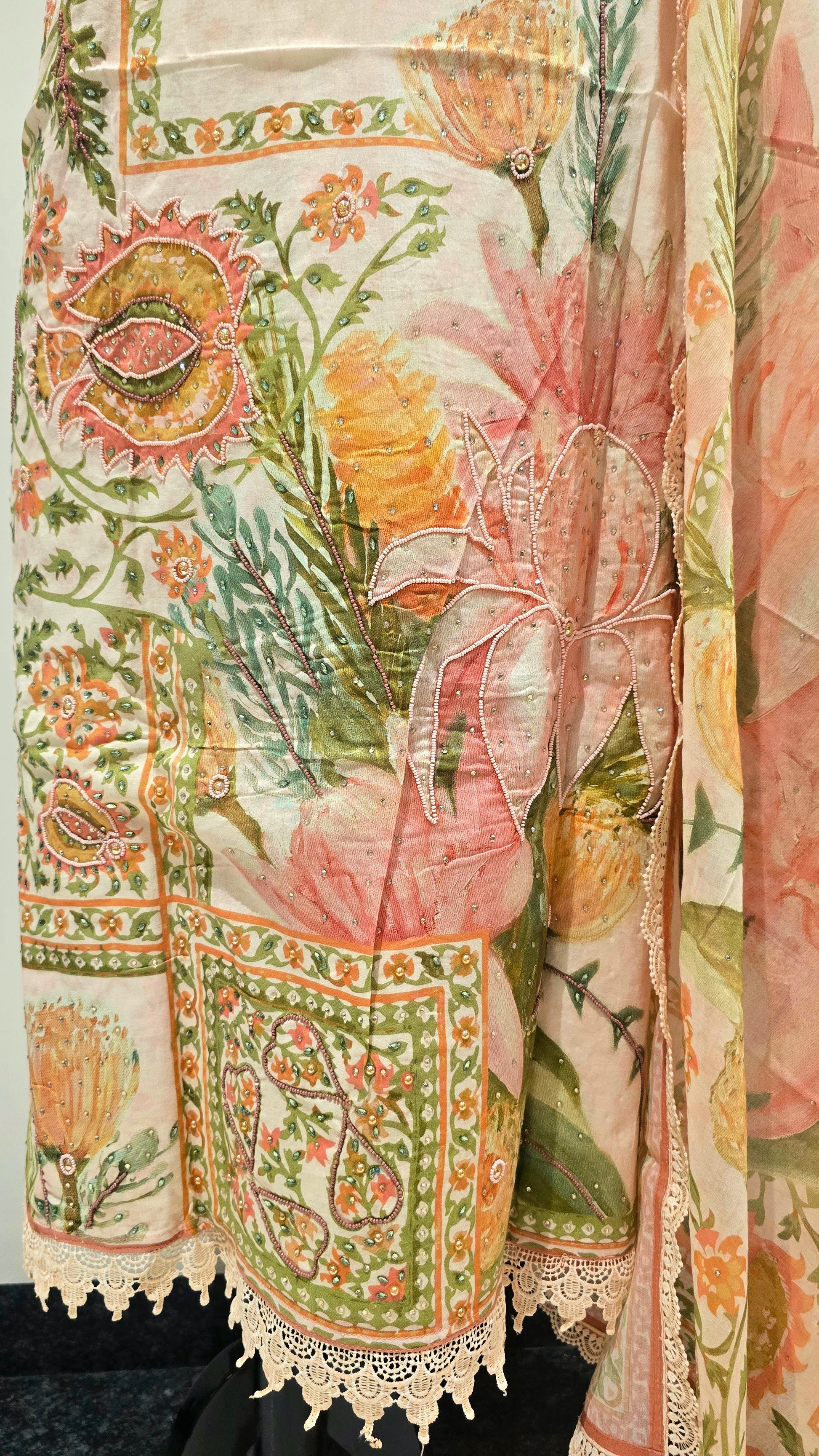 An unstitched beauty in pure mul cotton, this suit is adorned with beadwork, refined lacework, and an elegant asymmetric print.