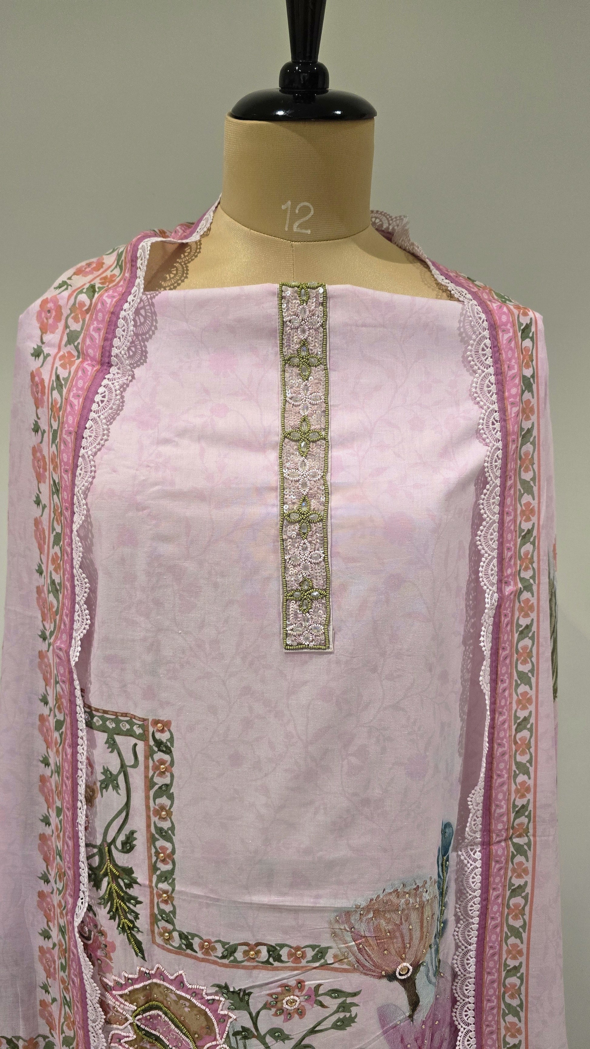 Unstitched and refined in pure mul cotton, this set is decorated with beadwork, elegant lacework, and a modern asymmetric print.
