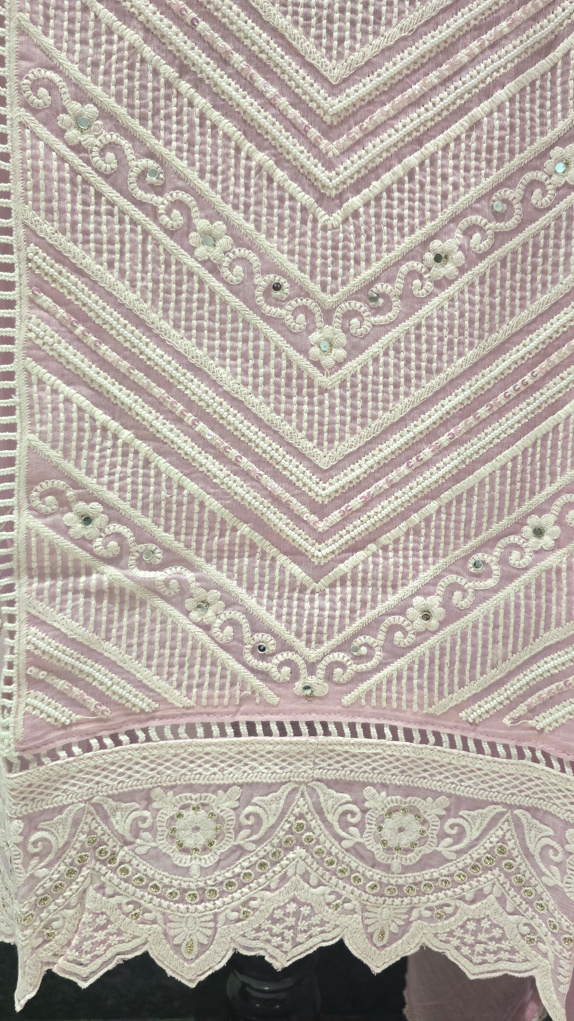 Crafted in pure Mul Chanderi, this designer suit features a richly embroidered neckline and intricate detailing throughout.