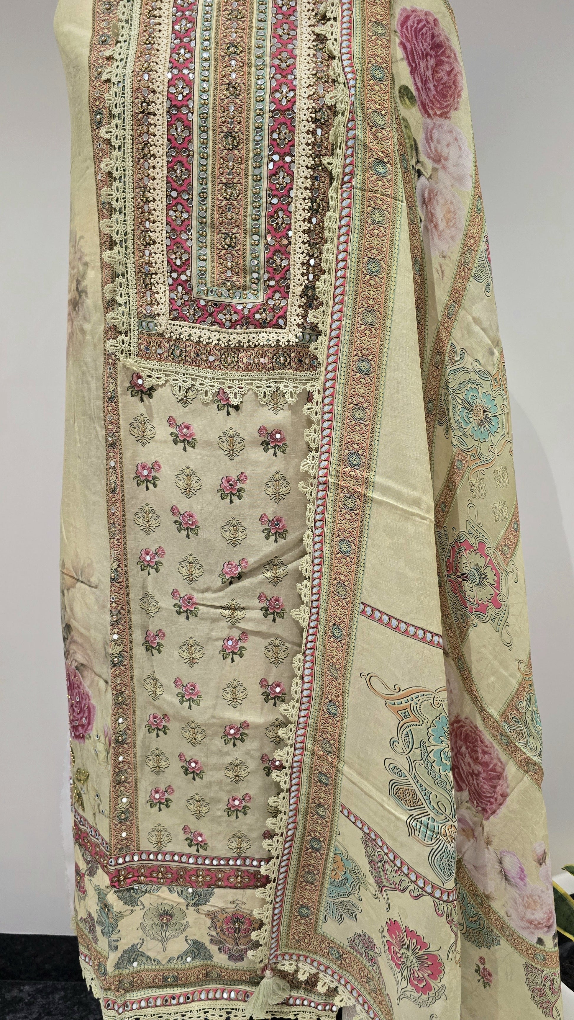 This unstitched viscose linen suit is adorned with digital prints, elegant lacework, and sparkling mirror work. A perfect blend of tradition and trend for festive or celebratory wear.