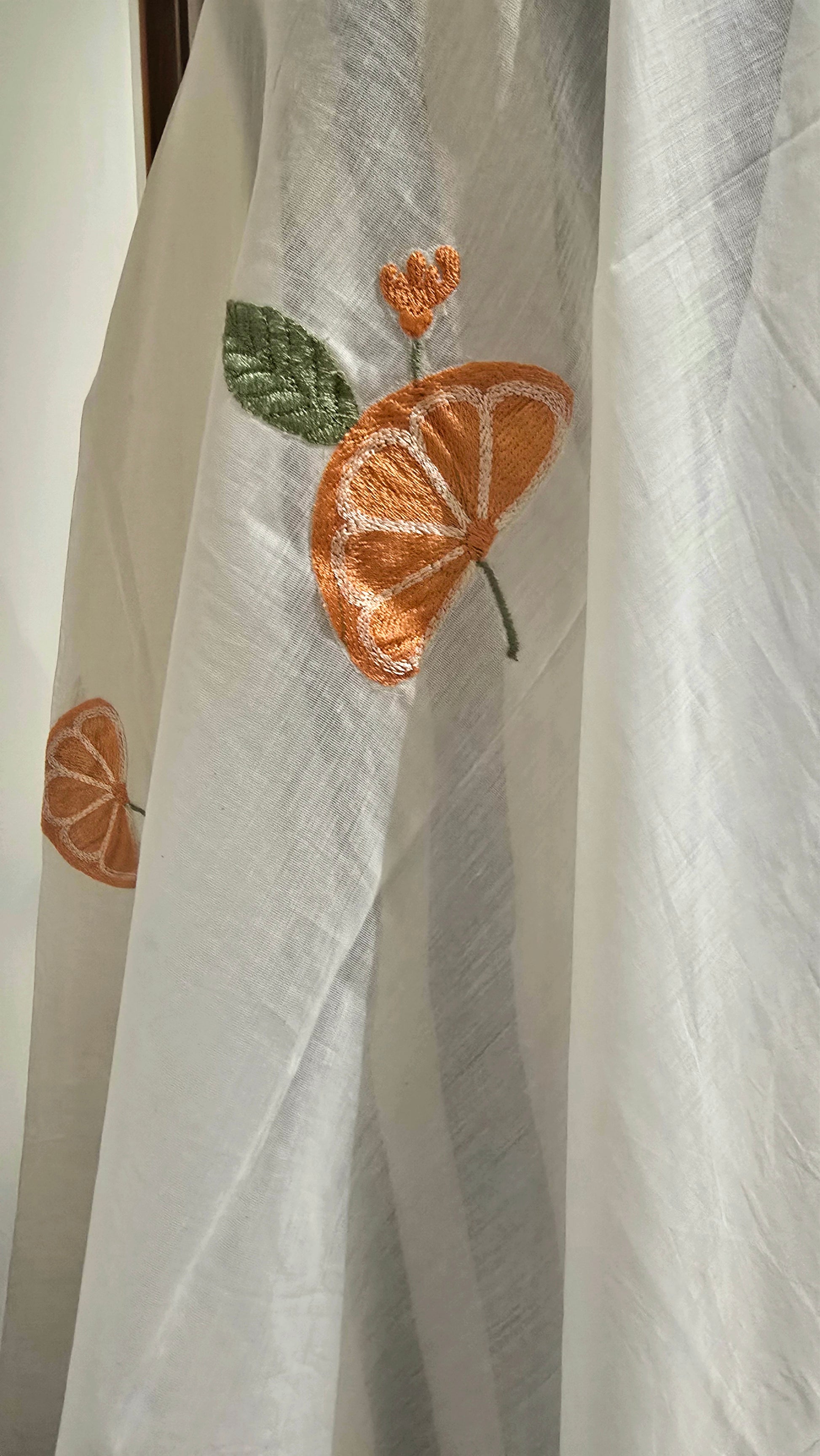In pure Mul Chanderi, this suit features summery tangerine threadwork paired with delicate lace accents for a breezy, radiant look.