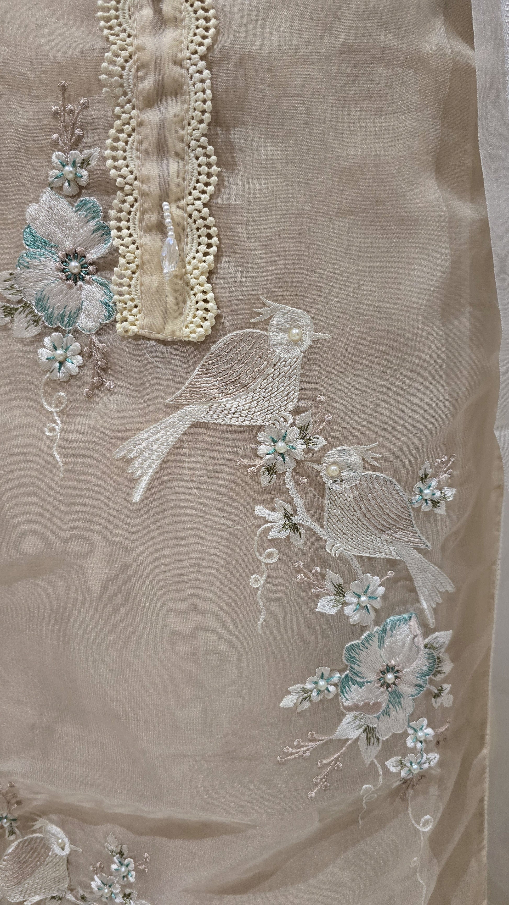 The Tishya Birdsong Suit in breezy summer organza showcases delicate threadwork, shimmering bead detailing, and playful beaded tassels, paired with a stunning hand-painted dupatta that captures the charm of slow, summer elegance.