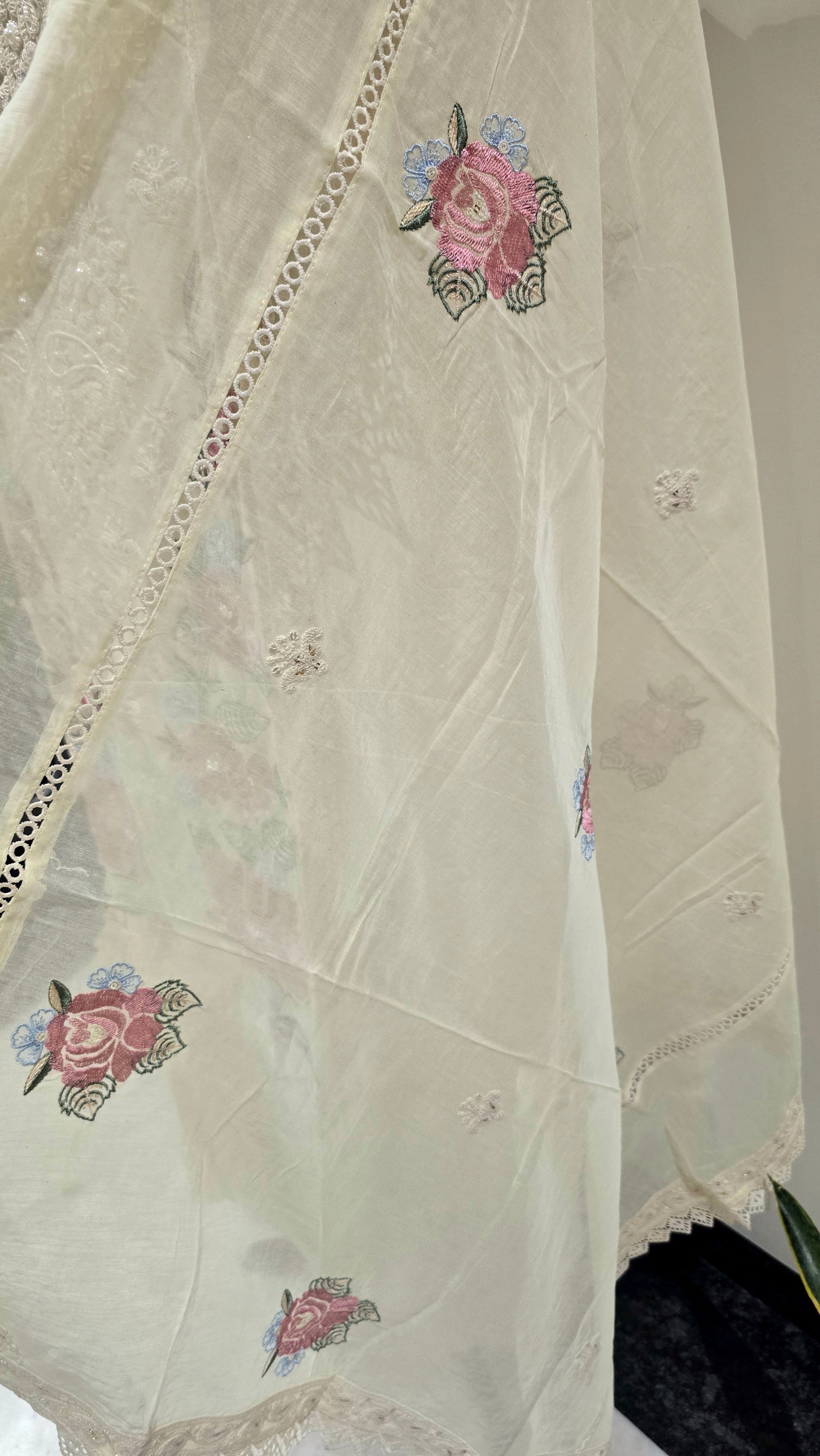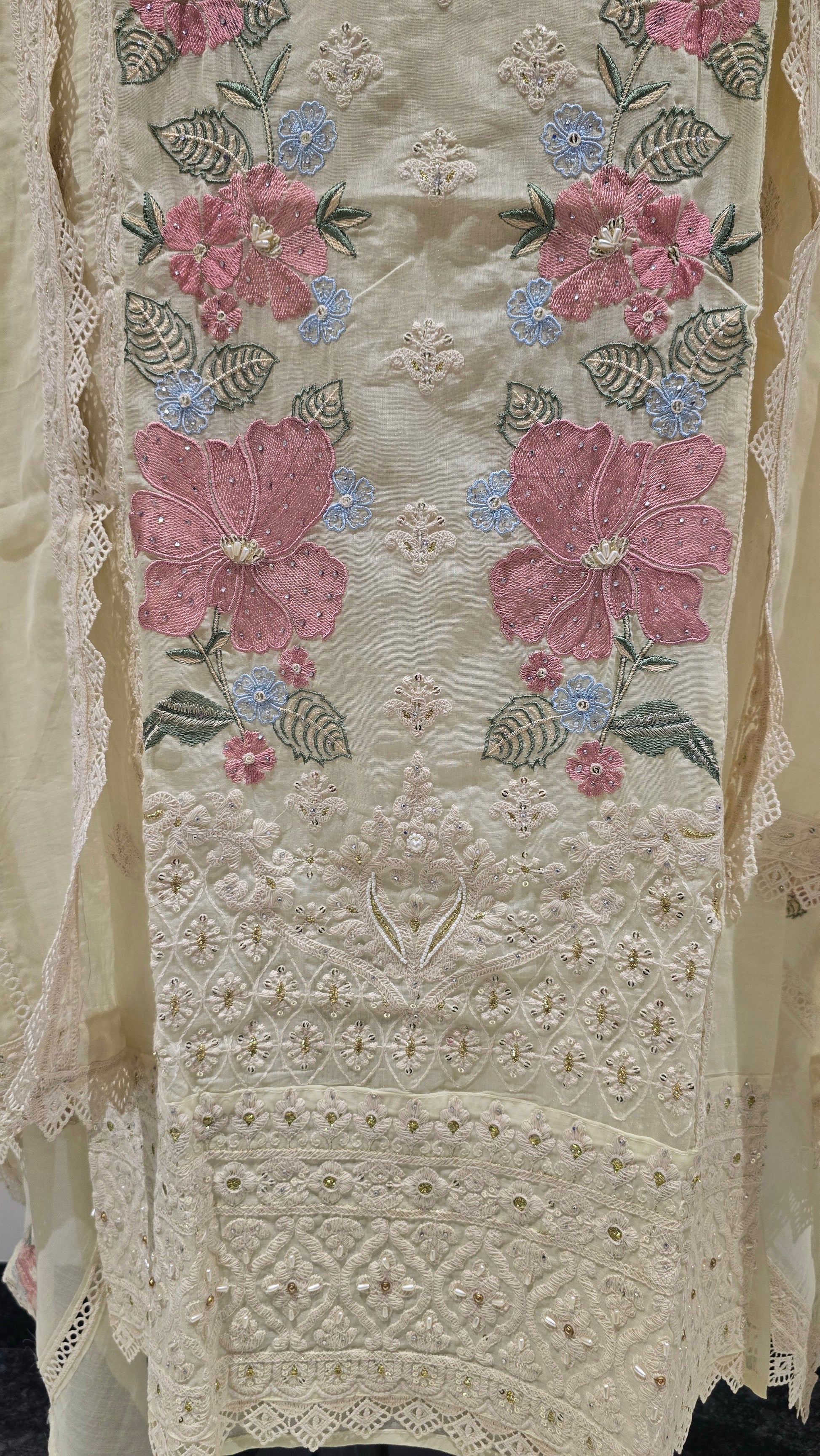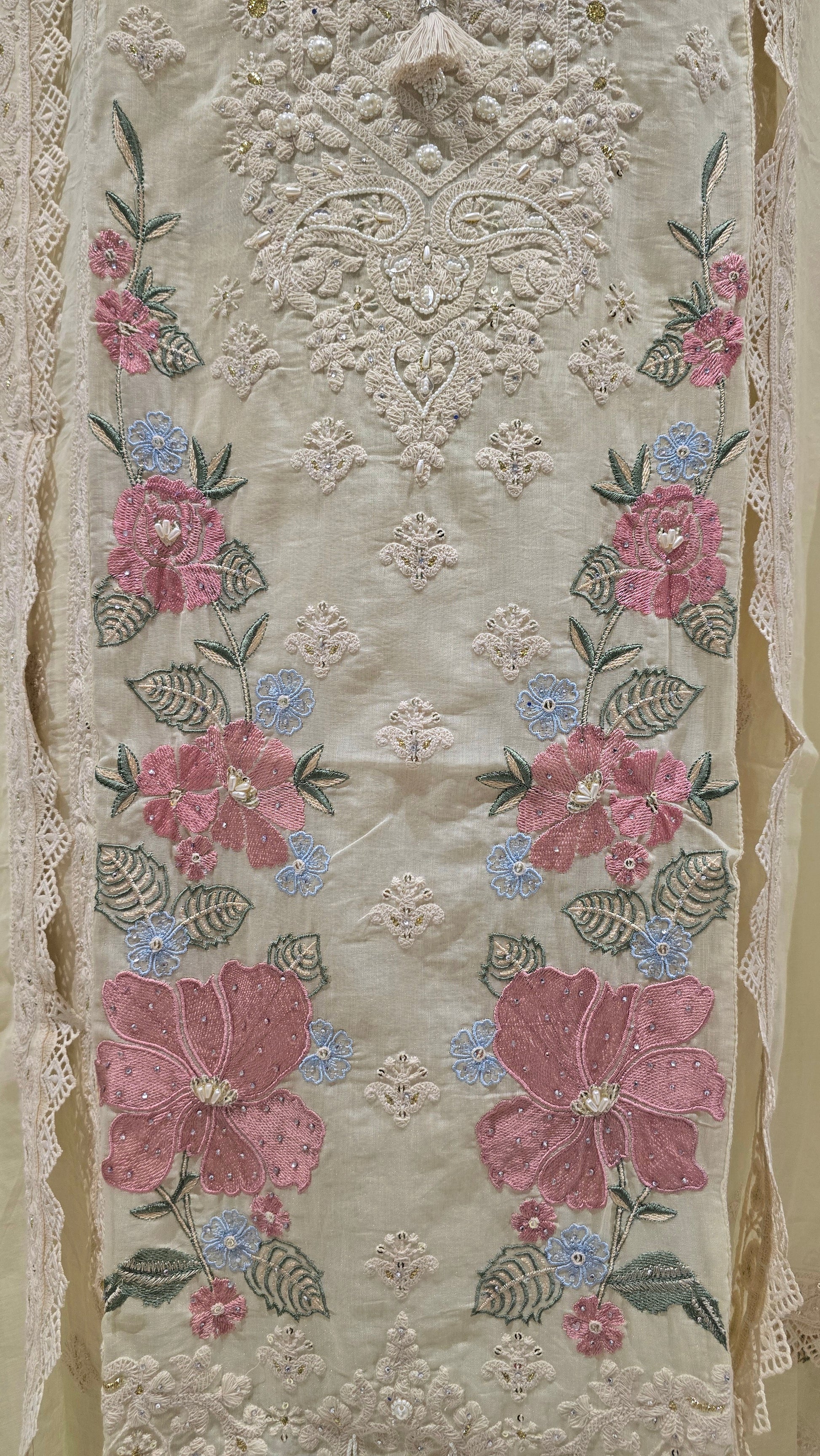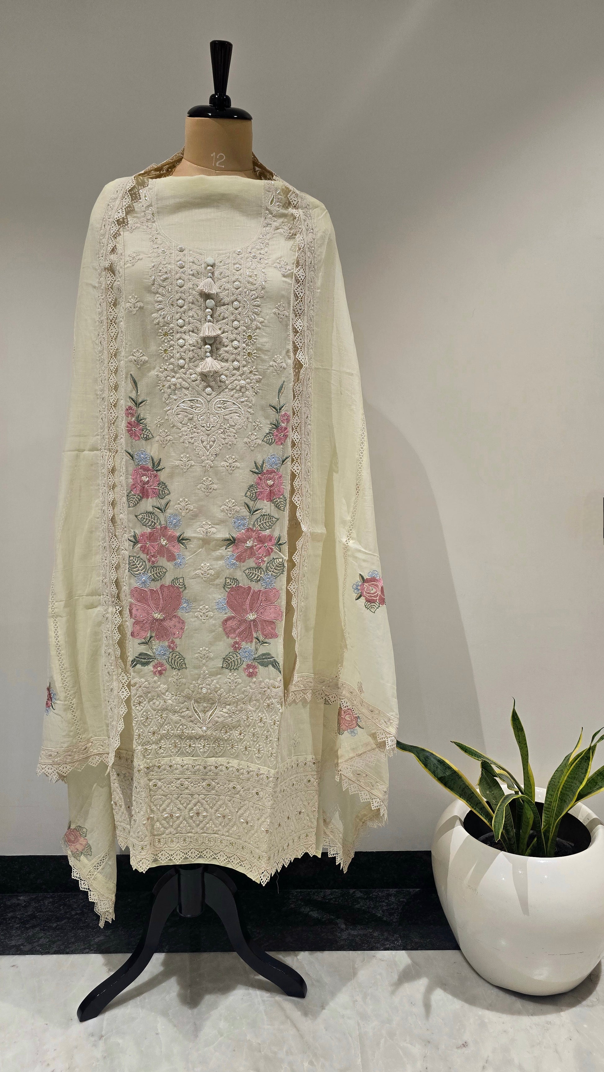 Tailored in pure mul, this sunshine-yellow suit features intricate threadwork and a delicately finished neckline adorned with soft tassels.